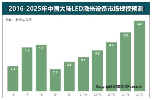 隨著Mini LED的商用,特別是未來Micro LED等新型顯示技術的逐步成熟量產(chǎn),預計LED行業(yè)將重回快速成長通道,相關激光設備也將從切割設備擴展為切割、裂片、剝離、修復等多種設備,有望帶動中國大陸LED相關激光設備市場突破6億,預計2025年達到6.6億元人民幣的規(guī)模。